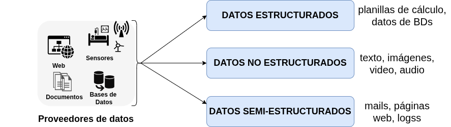 Uno de los problemas a los que se debe enfrentar la colección, es la manipulación de los diferentes tipos de datos a recuperar: estructurados, semi-estructurados y sin estructura, como podemos obervar en la imagen siguiente: