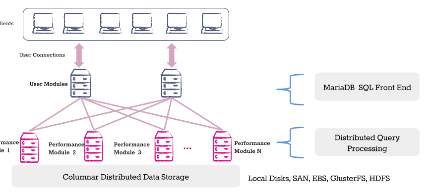 Como podemos observar en la siguiente figura (obtenida de acá), el almacenamiento es distribuído donde cada nodo posee columnas enteras o partes de ellas, según el requerimiento de espacio y rendimiento. Como podemos observar, cuando un cliente hace una consulta, el MODULO DE USUARIO (UM) la interpreta y divide el trabajo. Luego, los MODULOS DE PERFORMANCE (PMs) ejecutan los fragmentos de la consulta en paralelo