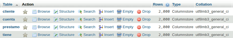 Entramos al phpMyAdmin. Como podemos observar en la interface Web, las tablas y BDs creadas son similares cuando estan orientadas a las filas y cuando lo estan a las columnas. Es decir visualmente se ven iguales. Sin embargo, podemos observar en las características de las tablas que fueron creadas orientadas a columnas, como vemos en la figura siguiente.